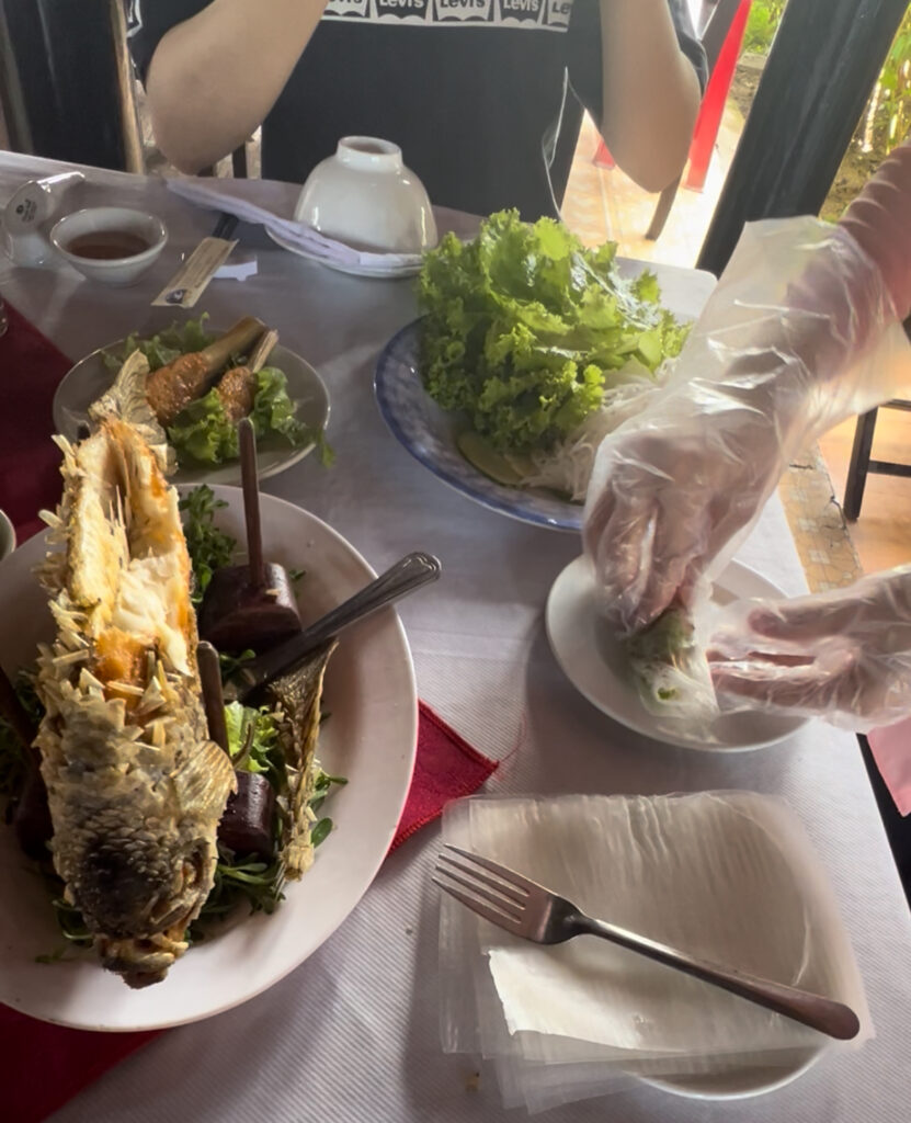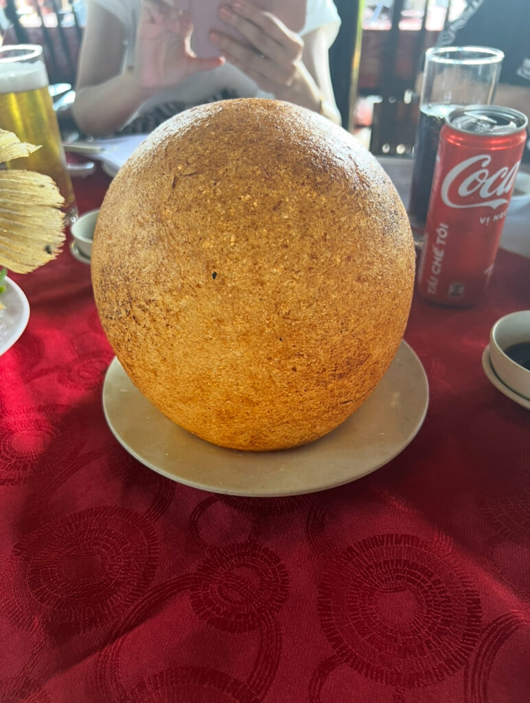 ツアー最後はレストランでのコース料理。生春巻きやフォーなど定番のほかに、大きな丸い料理が出てきて「これは何!?」とザワザワ。もち米で作られたベトナム料理だそうで、初めての味にびっくり。